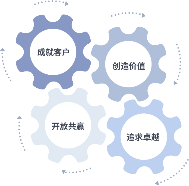 成就客户是一切决策的出发点,创造价值是衡量所有工作的标准,追求卓越是壹号娱乐(YIHAO)做事做人的态度,开放共赢是壹号娱乐(YIHAO)的格局也是最终的结果。价值观的齿轮环环相扣,推动着组织里的每个人不断向前。
